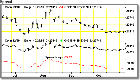 Commodity spreads ( or straddles) measure the price difference between two different contracts, usually futures contracts. The price difference is often analyzed in special futures spread charts. Spreads can also measure the difference between a cash contract and a futures contract ( referred to as the basis) or the price difference between two option contracts, or various combinations of the above. For the purpose of this section you will examine spreads from the context of the price difference between two different futures contracts.(see figure 6)