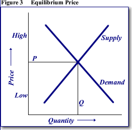 Price is derived by the interaction of supply and demand. The resultant market price is dependant upon both of these fundamental components of a market. An exchange of goods or services will occur whenever buyers and sellers can agree on a price. When an exchange occurs, the agreed upon price is called the "equilibrium price", or a "market clearing price" . This can be graphically illustrated as follows: ( Figure 3)