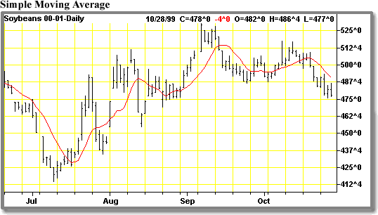 In a simple moving average each day's price receives equal weight. The moving average is plotted on the bar chart on top of the appropriate trading day and along with that day's price action. When the daily closing price moves above the moving avenge a buy signal is generated. When the daily closing price moves below the moving average a sell signal is generated.
