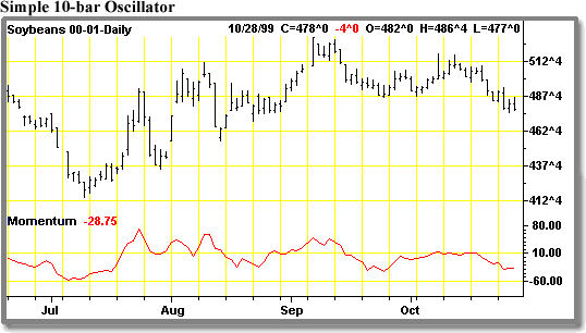 Where C is today's market close and Cx is the close “x" days prior. To construct a 10 day momentum line, today's closing price is subtracted from the closing price 10 days ago. If the most recent closing price is lower than the closing price 10 days prior, a negative number will be generated. Conversely if today's closing price is higher than the closing price 10 days ago a positive number will be generated. These values are then plotted on the top or bottom of the bar chart with a horizontal zero line in the middle. As with the moving avenge, the number of days chosen to compute the oscillator can vary, with shorter term oscillators ( 5 day ) producing a more sensitive line with more pronounced oscillations. A longer term oscillator ( 20 days ) produces a smoother line in which the oscillator swings are less pronounced.