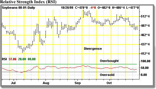 One of the most valuable ways to utilize an oscillator is to watch for a divergence. A divergence describes a situation when the trend of the oscillator moves in a different direction from the prevailing price trend. In an uptrend divergence occurs when prices continue to rise, but the oscillator fails to confirm the price move into new highs. This often provides an early warning of a possible price decline and is called bearish or negative divergence. In a downtrend, if the oscillator fails to confirm a new low in the price trend, a positive or bullish divergence exists, which warns of a potential price advance. An important requirement for divergence analysis is that the divergence should take place near the oscillator extremes of 70 and 30 respectively.